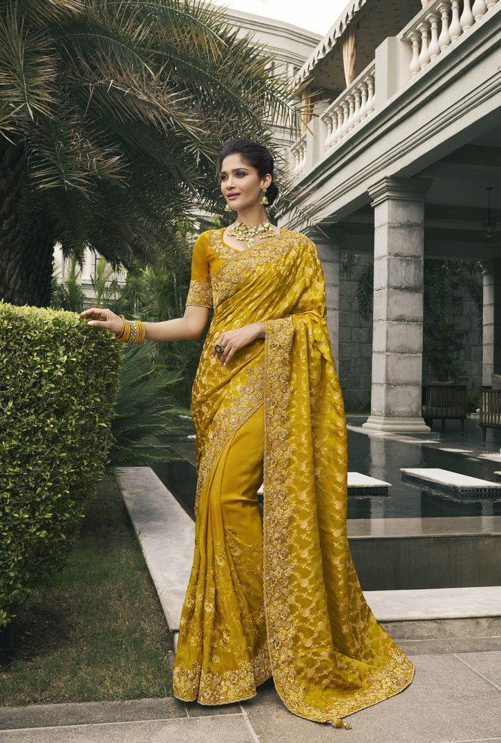Destination wedding partywear yellow/mustard yellow tissue silk jacquard half-half sari. Ethnic marriage haldi attire. Exclusive shaadi outfit. Sequins, stones, moti, mirror work, half zari weaving jacquard pallu, half plain tissue silk resham thread embroidered skirt and scallop bordered saree of 5.50 mts. with tassels. Yellow/mustard yellow silk unstitched blouse with work of 0.80 mts.